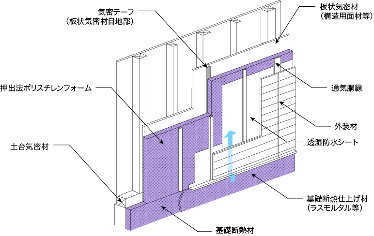 外壁の施工例(床部基礎断熱で外壁の気密層を板状気密材とした場合)