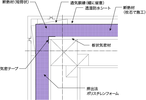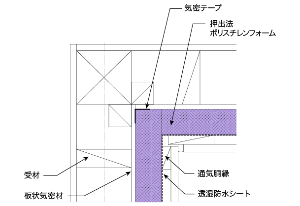 壁部は、気密の取り方の他、屋根部、床部の断熱位置などで取り合いの納まりが異なりますが、一例として板状気密材で気密を取る仕様を図に示しました