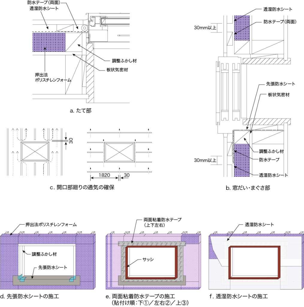 開口部廻りは、雨仕舞と気密性に配慮した納まりと入念な施行が必要です。