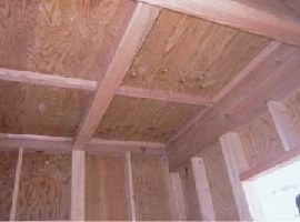 - 合板等の板状気密材を施行するために、軒桁の上面と小屋梁の上面を揃え、作業の安全性等を考慮して適宣受材を設置します。