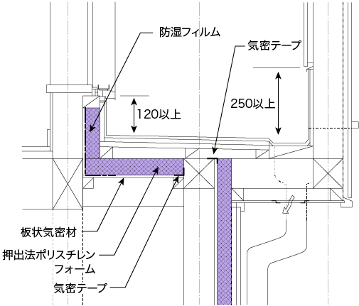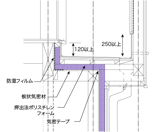 - 放水層立上り部は、雨仕舞のため通気層を取らない納まりとなっているので、防露対策として押出法ポリスチレンフォーム(XPS)の室内側に防湿フィルム(JIS A 6630住宅用プラスチック系防湿フィルム等)を施工します。