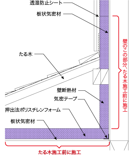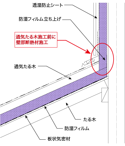 - 桁上断熱は下屋の垂木施行前に、桁上面及び下屋 壁面の気密断熱施行を実施する等施工手順に留意が必要です。