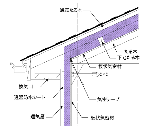 - たる木を軒先で切り、板状気密材を施行し継目をテープなどで目張りします。