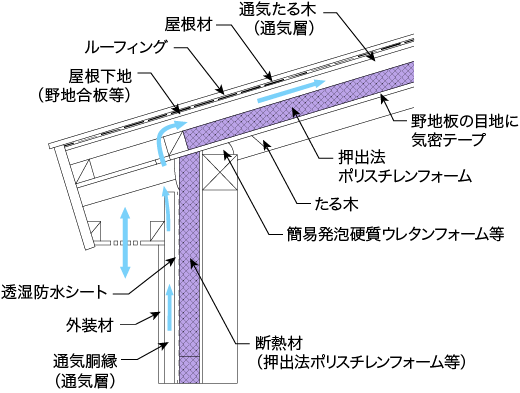 - 垂木及び野地板と壁断熱材の取り合い部は現場発泡ウレタンフォーム等で措置します。