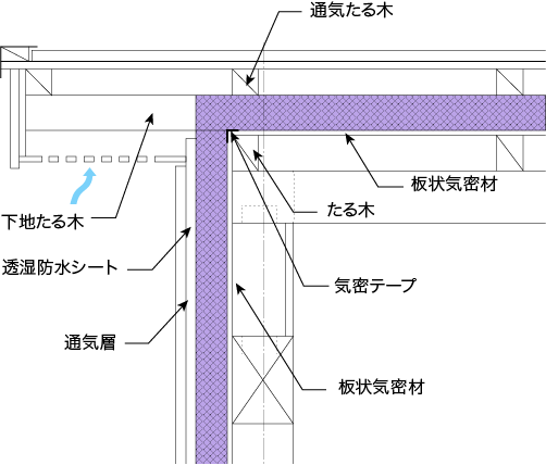 - 小屋梁の上面に板状気密材を施行し、継ぎ目を気密テープで目張りするか、住宅用防湿気密フィルムを連続施工します。小屋束との取り合いは気密テープで措置します。